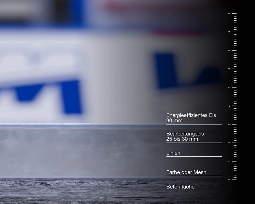Denn die Eisschicht wirkt als thermischer Widerstand zwischen Spieloberfläche und Kühlrohren. Je dünner die Eisschicht ist, desto geringer ist dieser Widerstand. So kann dieselbe Eistemperatur mit weniger Kühlleistung erreicht werden, was sowohl die Kosten als auch die Umweltbelastung reduziert.