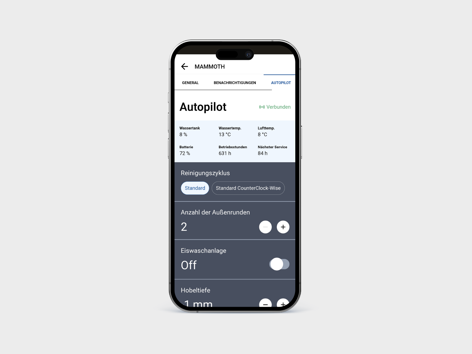 Dieses Geräte fährt von alleine – aber was, wenn es außer Kontrolle gerät? Nachdem die gewünschte Maschine mit dem Mobilgerät verbunden wurde, zeigt das Display den Batteriestatus sowie den Wasserstand an und ermöglicht die Einstellung der wichtigsten Parameter, wie die Hobeltiefe des Messers, die Wasserdosierung und die Geschwindigkeit. Diese Parameter können jederzeit geändert und angepasst werden, auch während die Maschine in Betrieb ist. Die App zeigt auch verschiedene Reinigungsmuster an, von der Schnellreinigung bis zum klassischen Resurfacing. Sobald die gewünschte Einstellung ausgewählt und der Autopilot gestartet wurde, beginnt die Maschine mit der Arbeit, wobei die dafür benötigte Zeit auf dem Bildschirm ablesbar ist.