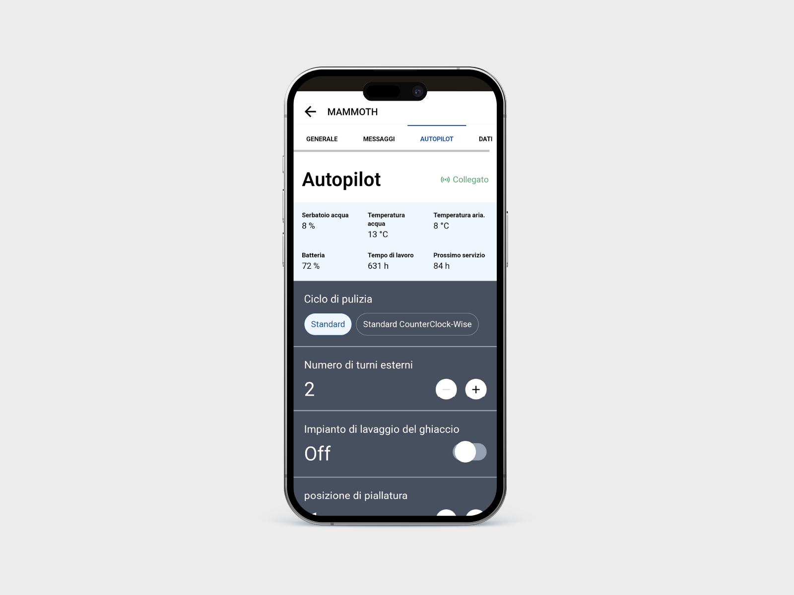 Le rasaghiaccio e quindi il sistema Autopilot dispone di un avanzato sistema di posizionamento. Sensori strategici sono posti sia sulla macchina che nell’arena mentre un’unità di calcolo ad alta capacità gestisce una mole impressionante di dati per la guida autonoma. Questa tecnologia permette interventi precisi e puntuali sul ghiaccio, eliminando possibili ritardi. La gestione avviene comodamente via smartphone con Connect, offrendo una varietà di schemi di pulizia per una superficie impeccabile.